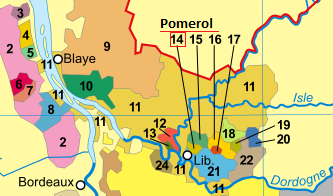 Pomerol: nằm về phía Đông của Bordeaux bên hữu ngạn của song Dordogne mảnh đất này nhỏ nhưng lại nổi danh là có Chateaux làm rượu rất ngon và giá bán cũng đắt dễ sợ, mặc dầu Pomerol chẳng hề được nhắc đến trong bảng xếp hạng 1855. Đứng đầu là Chateau Pestrus làm ra một trong những chai rượu vào hàng đắt nhất thế giới.