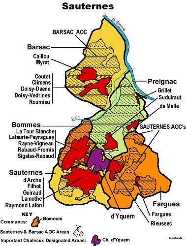 -Saint-émilion: tiếp giáp với Pomerol về phía Đông Nam là những ruộng nho bát ngát của quận St.Émilion bao quanh một ngôi làng cổ với những kiến trúc từ thế kỉ thứ 12 còn sót lại. Rượu ở khu vực St.Émilion được xếp thành hai đẳng cấp là Premiers Grands Crus Classes và Grands Crus Classes. Sauternes Sauternes: tiếp giáp với quận Pesac Léognan về phía Nam là Sauternes, đây là nơi sản xuất ra rượu vang trắng có vị ngọt đậm đà như mật ong, thơm tho như nước cam mà người ta vẫn ca tụng không nơi đâu sánh kịp. Sở dĩ được mùi vị đó là vì những chum nho trắng hái trễ ở vùng này khi gặp thời tiết nóng và ẩm hay bị một loại nấm mốc gọi là Botryis tấn công. Botryis làm vỏ nho bị thủng những lỗ li ti khiến nước bên trong bốc hơi đi và chỗ nước nho còn lại trở thành cô dọng với mức độ đường rất cao, nhưng chỉ có nấm Botryis mới biến đổi chất đường trong nước nho thành thơm ngon đặc sắc nên người ta gọi là Mốc Quý Phái. Enter-Deuxmers