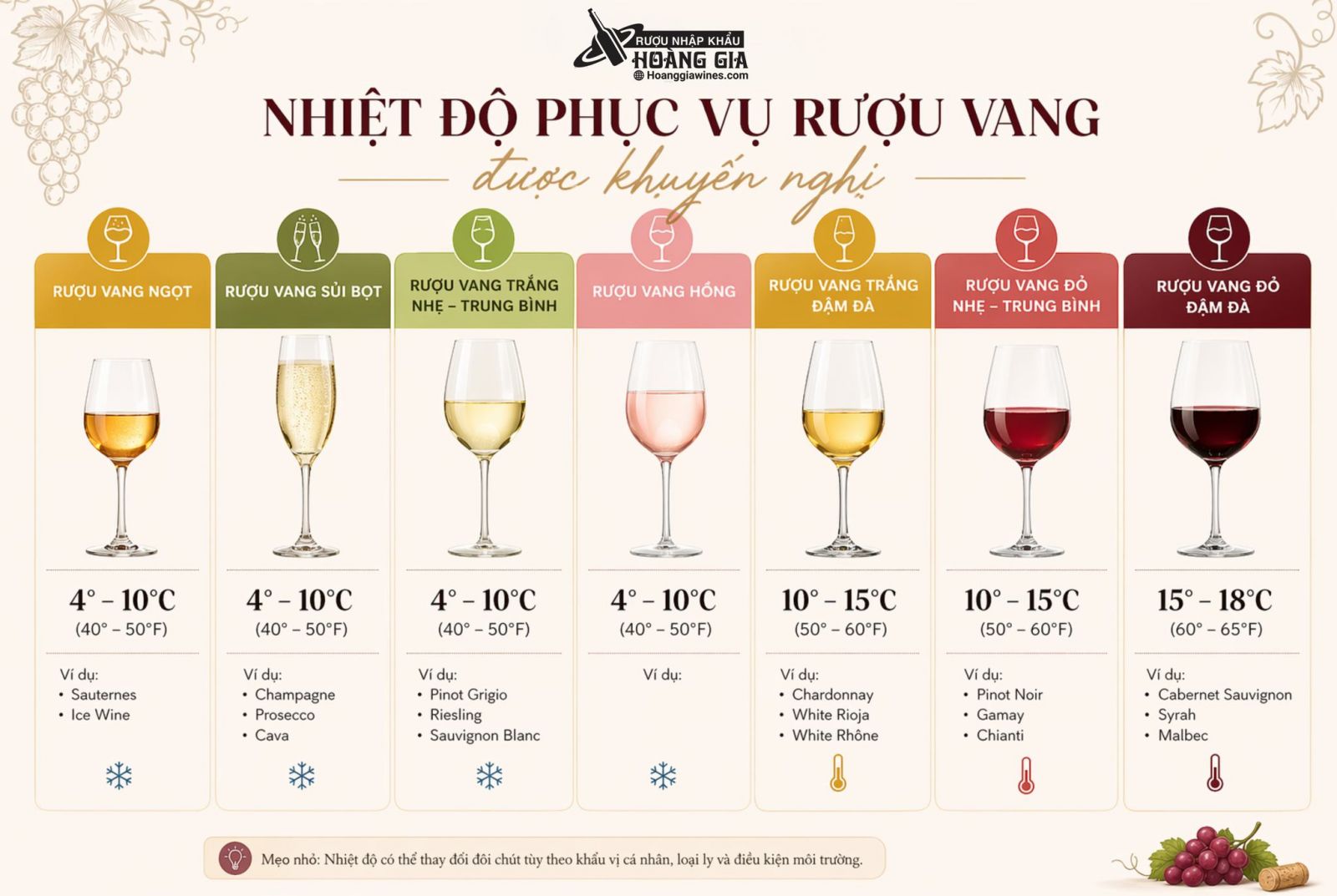Nhiệt độ phục vụ rượu vang là yếu tố quyết định đến hương thơm, cấu trúc và trải nghiệm tổng thể. Dù là vang đỏ, vang trắng hay champagne, mỗi loại đều có “mức nhiệt lý tưởng” riêng.