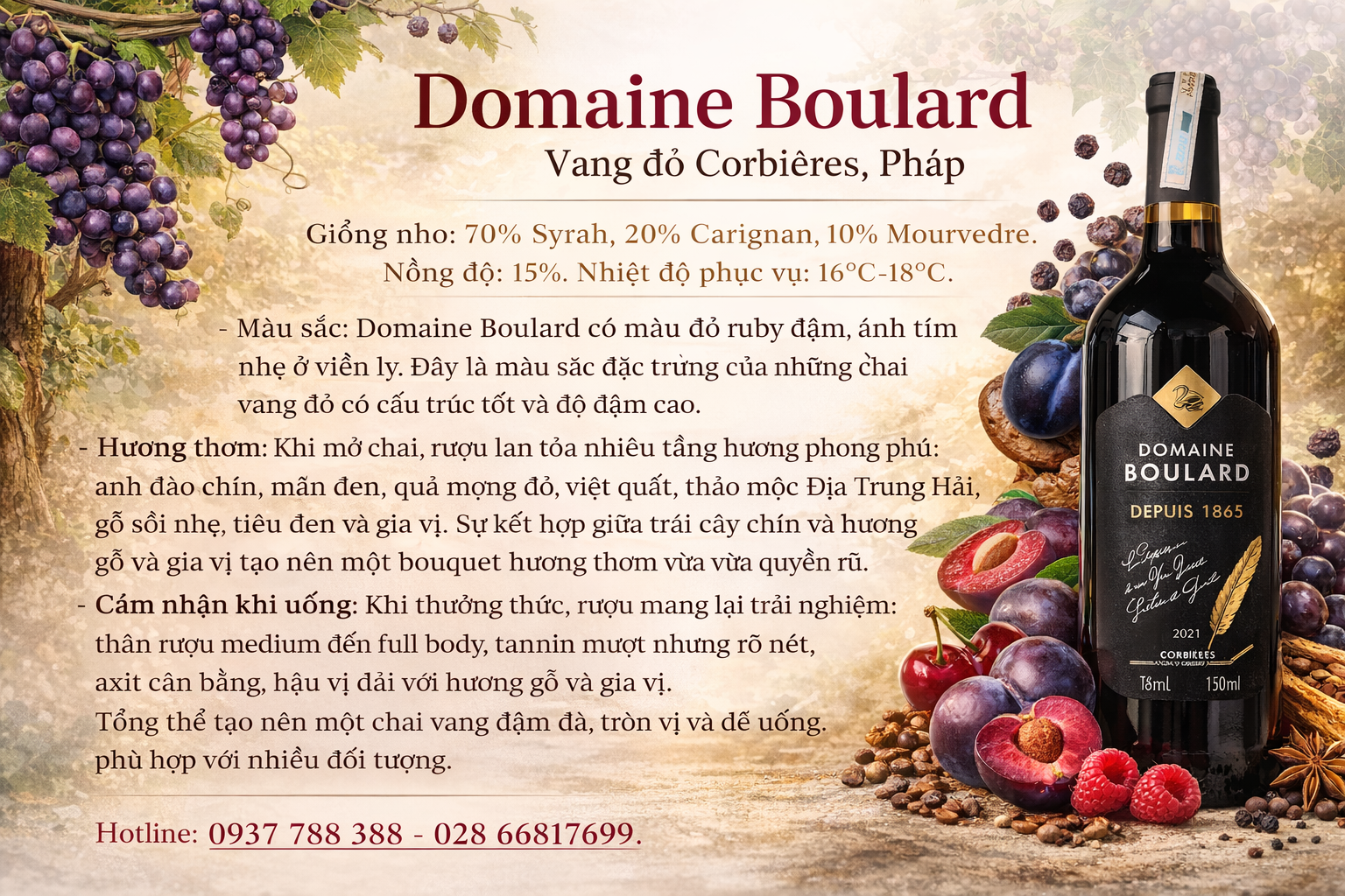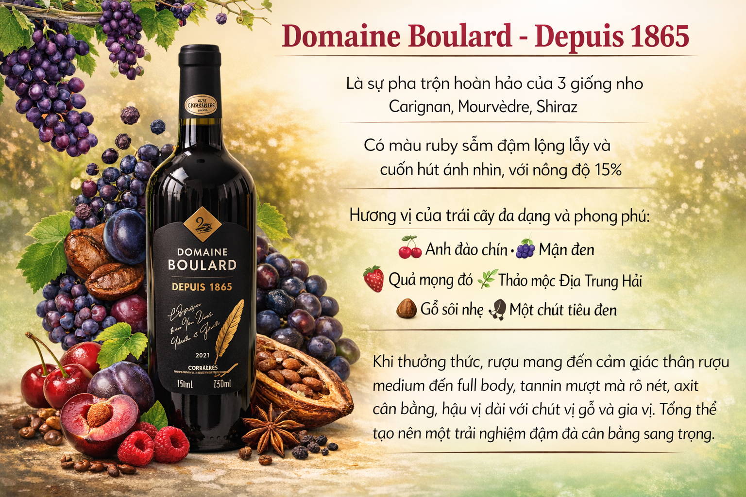 Trong thế giới rượu vang Pháp đầy tinh hoa, những chai vang mang dấu ấn lịch sử luôn có sức hấp dẫn đặc biệt đối với người yêu rượu. Domaine Boulard – Depuis 1865 là một trong những chai vang đỏ tiêu biểu thể hiện sự giao thoa giữa truyền thống lâu đời và phong cách vang hiện đại. Với xuất xứ từ vùng Corbières – miền Nam nước Pháp, chai rượu này mang đến trải nghiệm thưởng thức đậm đà, mạnh mẽ nhưng vẫn giữ được sự tinh tế đặc trưng của vang Pháp.