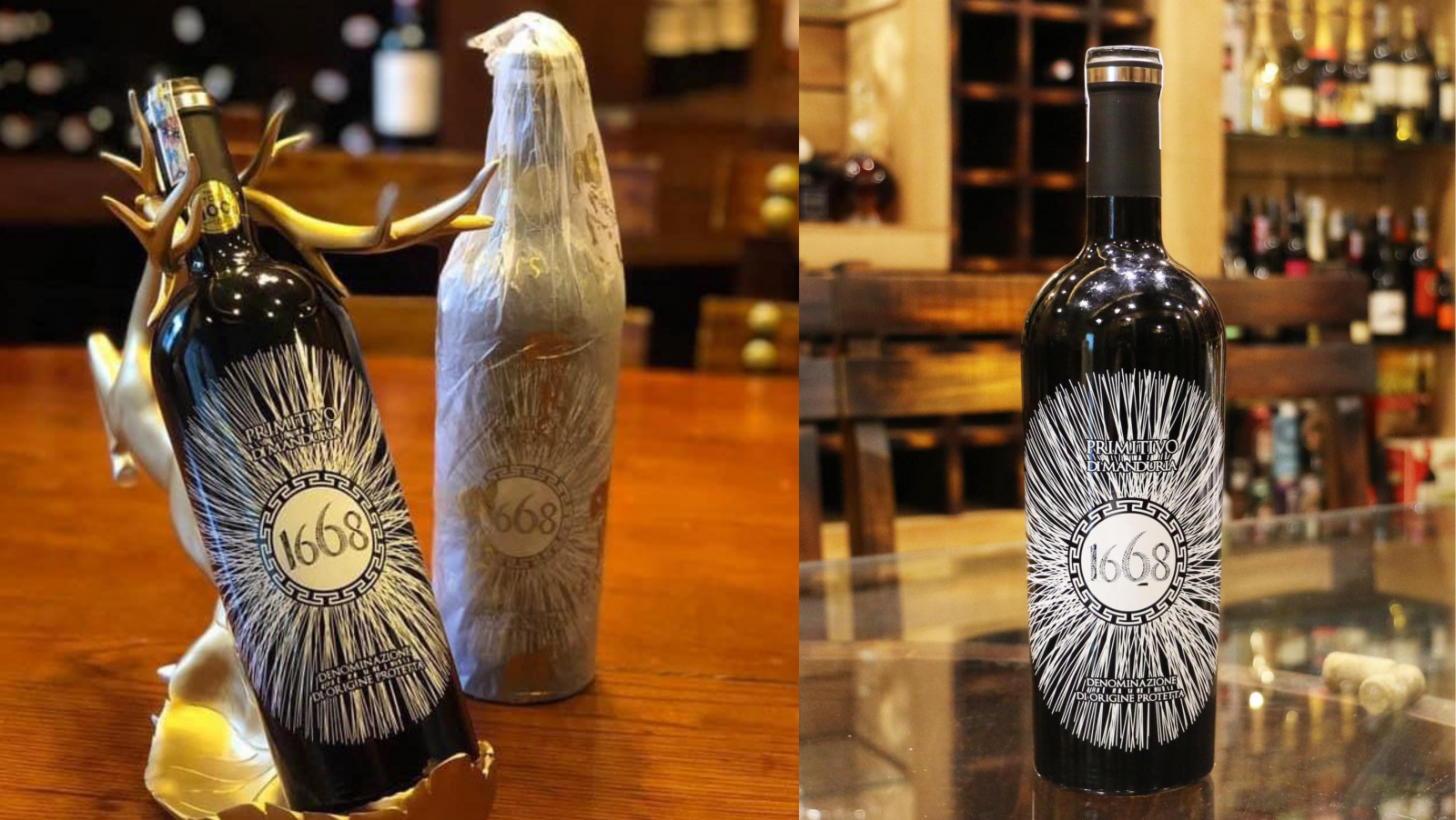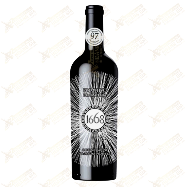 - 1668 Primitivo di Manduria DOP Riserva làm từ 100% nho Primitivo với nồng độ rượu 15% mang trong mình hương vị đậm đà của trái cây chín mọng như mận đen, anh đào và mâm xôi đen. Và mang cho mình màu đỏ ruby sẫm phản phất chút ánh tím